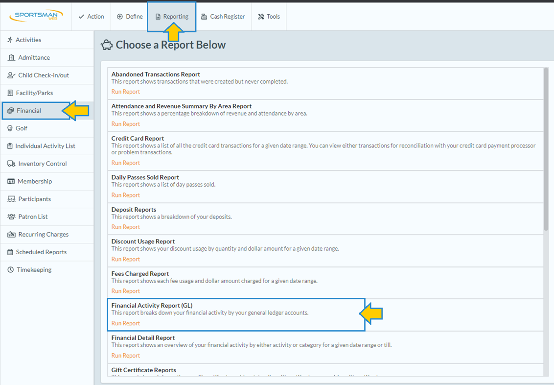 begin navigate to Reports>Financial>Financial Activity Report (GL) as