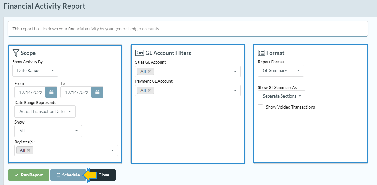 permission to run financial reports within Sportsman is required to set up Scheduling