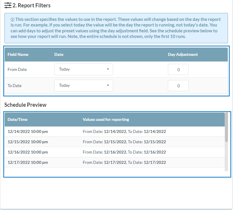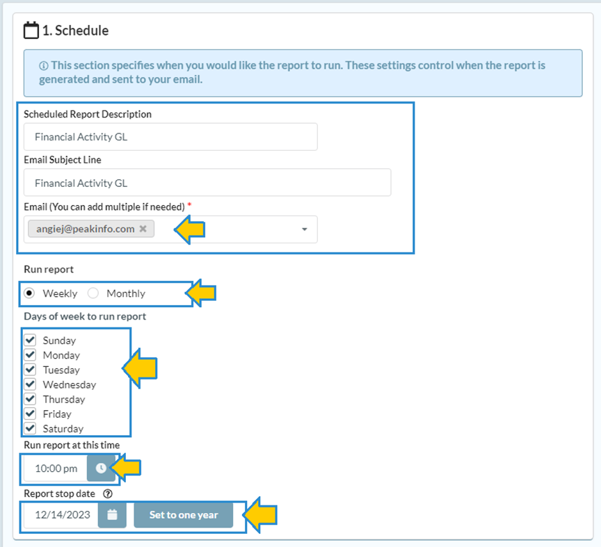 whether your report should run weekly or monthly. Select the day(s) of the week
