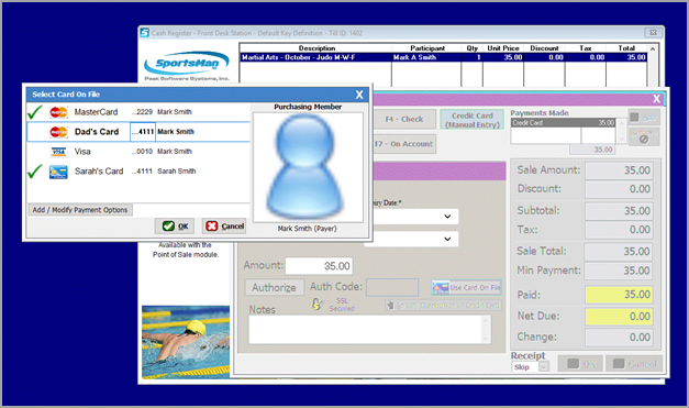 ActivityReg cash register payment options screen. At this time however, front desk staff will