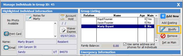 File for a Patron, select them from the LookUp feature and then click [Modify] on the Manage Individuals screen.