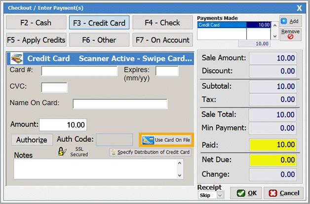 Card On File] button will appear on the credit card options in the Payment screen. If it is preferrable to use