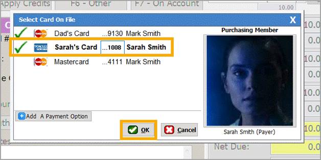 select a card on file with which to charge the purchase, and click [OK]. This will bring back the payment