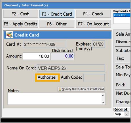 Clicking the [Authorize] button will complete the sale